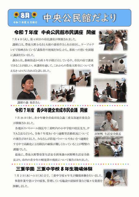 中央公民館の公民館だよりのページへ「中央公民館だより2025年8月号」を掲載いたしました。ぜひご覧ください。