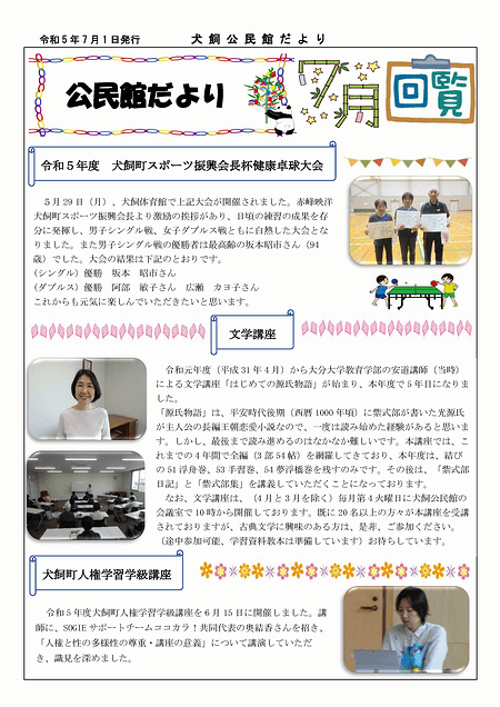 犬飼公民館の公民館だよりのページへ「犬飼公民館だより2025年7月号」を掲載いたしました。ぜひご覧ください。