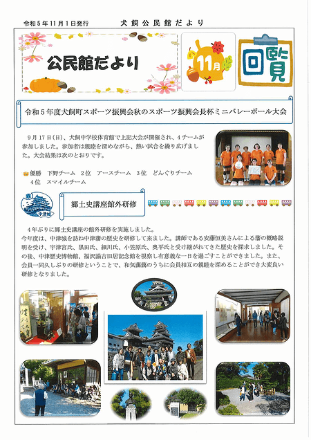 犬飼公民館の公民館だよりのページへ「犬飼公民館だより2024年10月号」を掲載いたしました。ぜひご覧ください。