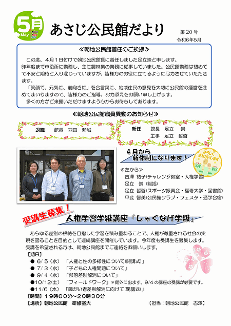 朝地公民館の公民館だよりのページへ「朝地公民館だより2024年5月号」を掲載いたしました。ぜひご覧ください。