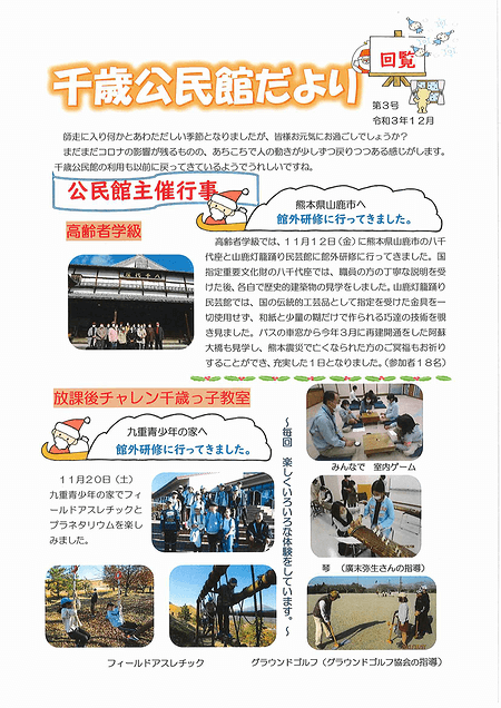千歳公民館の公民館だよりのページへ「千歳公民館だより2021年12月号」を掲載いたしました。ぜひご覧ください。
