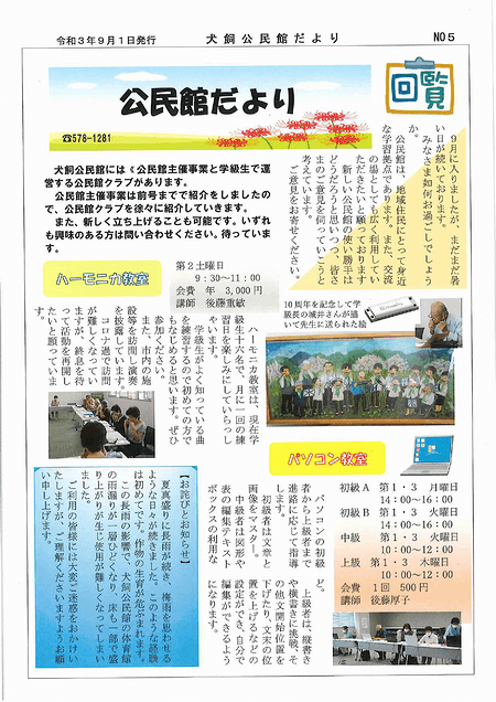 犬飼公民館の公民館だよりのページへ「犬飼公民館だより2021年9月号」を掲載いたしました。ぜひご覧ください。