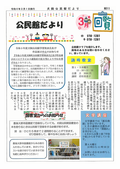 犬飼公民館の公民館だよりのページへ「犬飼公民館だより2022年3月号」を掲載いたしました。ぜひご覧ください。