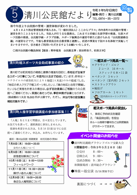清川公民館の公民館だよりのページへ「清川公民館だより2021年5月号」を掲載いたしました。ぜひご覧ください。