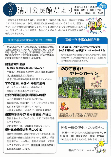 清川公民館の公民館だよりのページへ「清川公民館だより2021年9月号」を掲載いたしました。ぜひご覧ください。