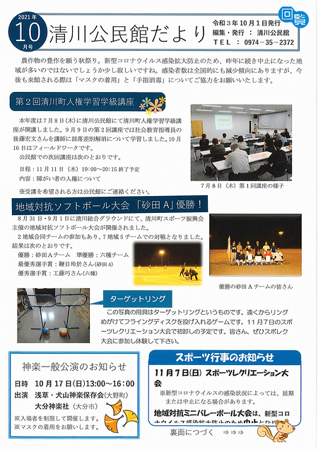 清川公民館の公民館だよりのページへ「清川公民館だより2021年10月号」を掲載いたしました。ぜひご覧ください。