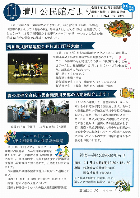 清川公民館(神楽会館)の公民館だよりのページへ「清川公民館だより2021年11月号」を掲載いたしました。ぜひご覧ください。