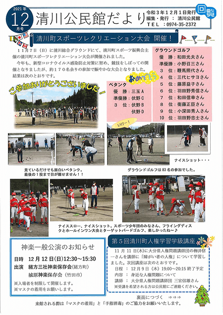 清川公民館の公民館だよりのページへ「清川公民館だより2021年12月号」を掲載いたしました。ぜひご覧ください。