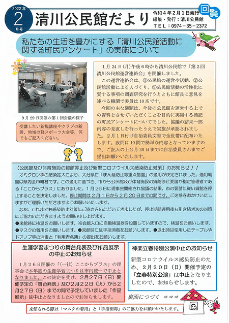 清川公民館の公民館だよりのページへ「清川公民館だより2022年2月号」を掲載いたしました。ぜひご覧ください。