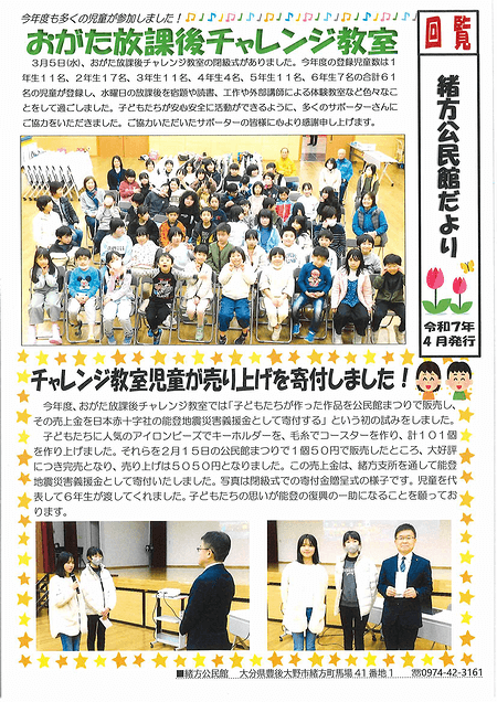 緒方公民館の公民館だよりのページへ「緒方公民館だより2025年4月号」を掲載いたしました。ぜひご覧ください。