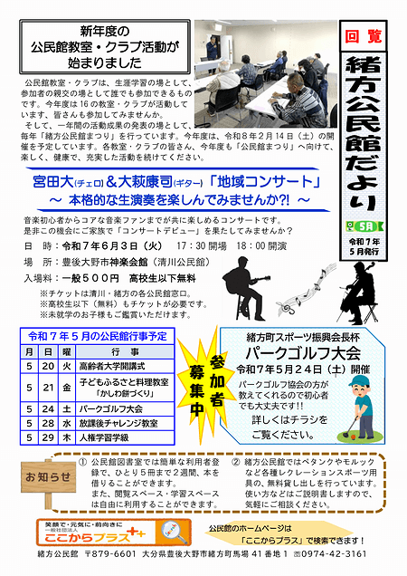 緒方公民館の公民館だよりのページへ「緒方公民館だより2025年5月号」を掲載いたしました。ぜひご覧ください。