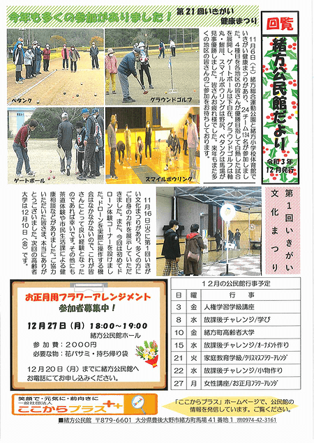 緒方公民館の公民館だよりのページへ「緒方公民館だより2021年12月号」を掲載いたしました。ぜひご覧ください。