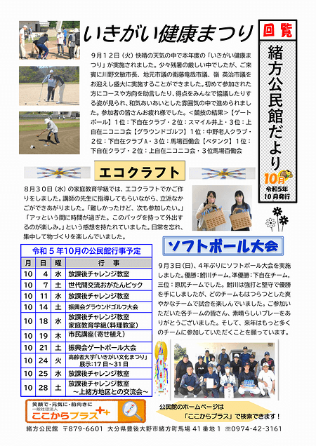 緒方公民館の公民館だよりのページへ「緒方公民館だより2023年10月号」を掲載いたしました。ぜひご覧ください。