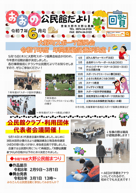 大野公民館の公民館だよりのページへ「大野公民館だより2025年6月号」を掲載いたしました。ぜひご覧ください。