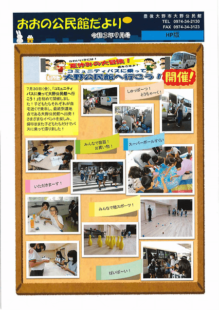 大野公民館の公民館だよりのページへ「大野公民館だより2021年9月号」を掲載いたしました。ぜひご覧ください。