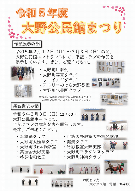 「大野公民館祭り2024年2月~3月」を掲載いたしました。