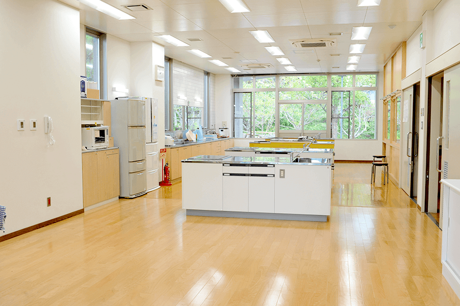 設備:丸イス10脚、調理台4台、ガスコンロ2台・オーブンレンジ2台・IHコンロ2台・電子レンジ2台・スチームオーブンレンジ1台・ミキサー2台・ハンドミキサー2台・電子炊飯器(1升)1台・ガス釜(2升)1台・冷蔵庫1台・電気ポット1台・洗濯機1台